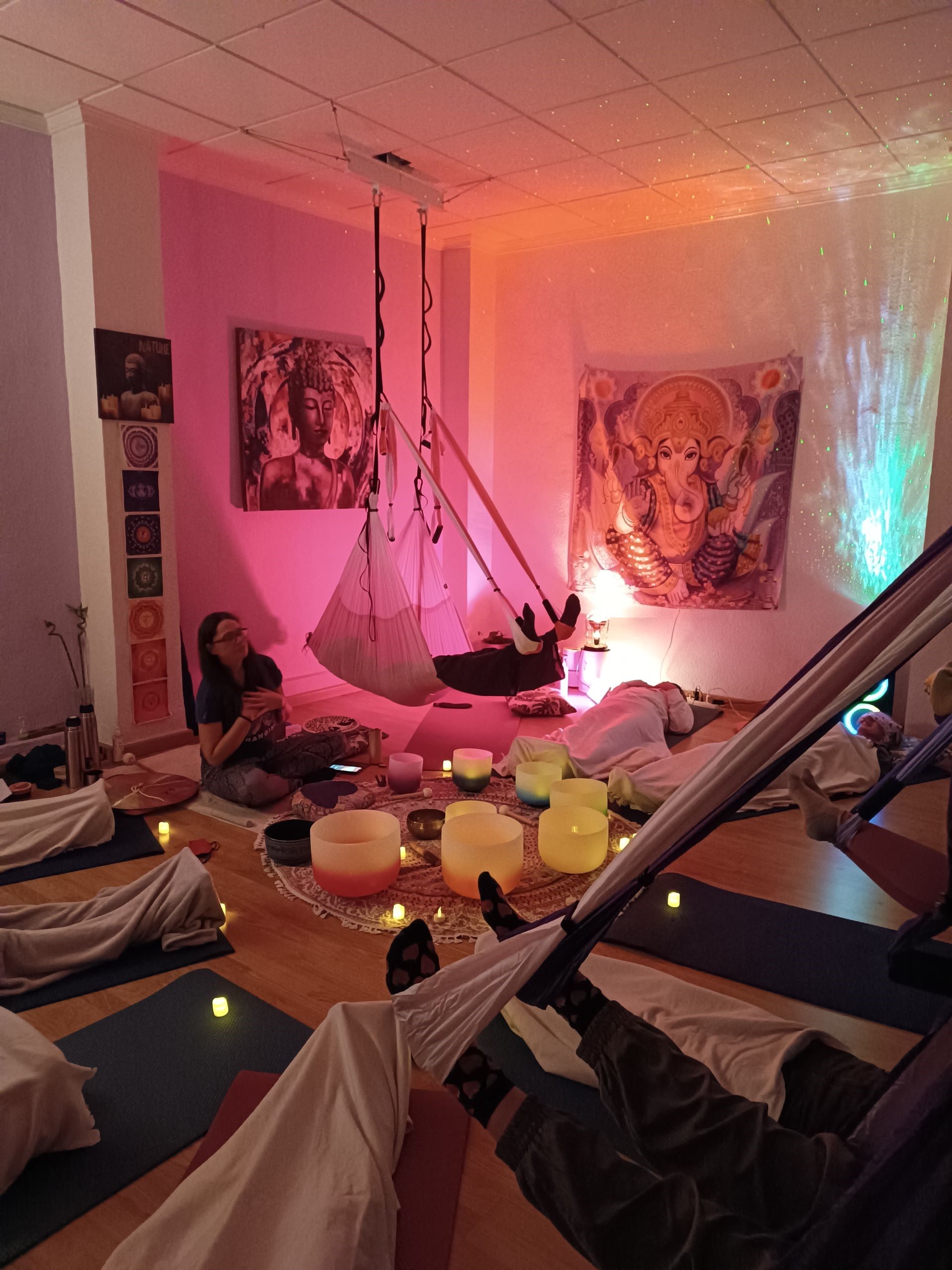 Baños sonoros y relajaciones en hamacas: descanso profundo y calma.
